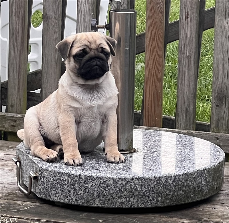 En helt vild vidunderlig lille pige, der ikke er nærig med Kys. Er altid der, hvor vi er. Elsker sine gåture, hvor hun ligger i front. Hun elsker flokken og leger meget med vores sorte Rosin. Når vi sidder i sofaen skal hun helst ligge helt oppe i hovedet på en.